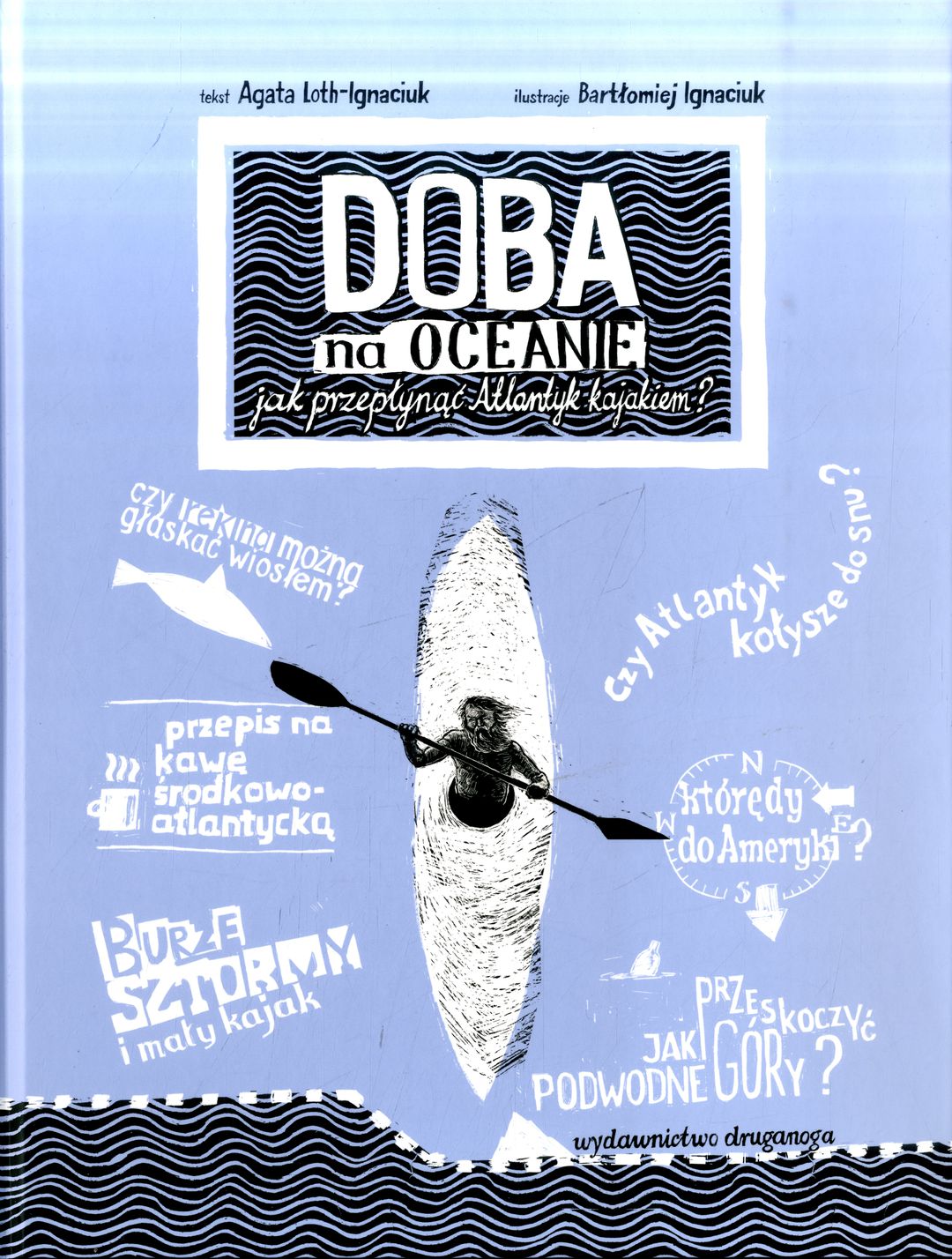 Książka graficzna "Doba na oceanie. Jak przepłynąć Atlantyk kajakiem?" to fascynująca opowieść o pierwszych dwóch wyprawach przez Atlantyk Aleksandra Doby, polskiego kajakarza, który jako pierwszy człowiek w historii przepłynął ocean kajakiem, z kontynentu na kontynent. Przeczytacie, jak zaplanować transatlantycką ekspedycję kajakową, przekonacie się, czy kajak oceaniczny jest z gumy i jak zmieścić na nim sprzęty żeglarskie, małą stocznię remontową oraz jedzenie na kilka miesięcy. Przeżyjecie burze i sztormy na oceanie, razem z bohaterem stawicie czoła największemu prądowi świata, dowiecie się też, czy istnieją podwodne góry i jak się nie zgubić na oceanie oraz gdzie na kajaku ukryte są sypialnia, kuchnia, łazienka. Poznacie nawet smak oceanicznej kawy! Nauczycie się robić rynny z opakowania po ciastkach i konstruować półki z karimaty. Sprawdzicie też, czy kąpiel z rekinem jest przyjemna, kogo można spotkać na oceanie, i czy wciąż istnieją statki widma. "Doba na oceanie. Jak przepłynąć Atlantyk kajakiem?" ilustruje niezwykłą ekspedycję i przekazuje mnóstwo informacji o Oceanie Atlantyckim. Publikacja powstała we współpracy z Aleksandrem Dobą i jest pierwszą książką o jego wyprawach kajakowych dla dzieci.