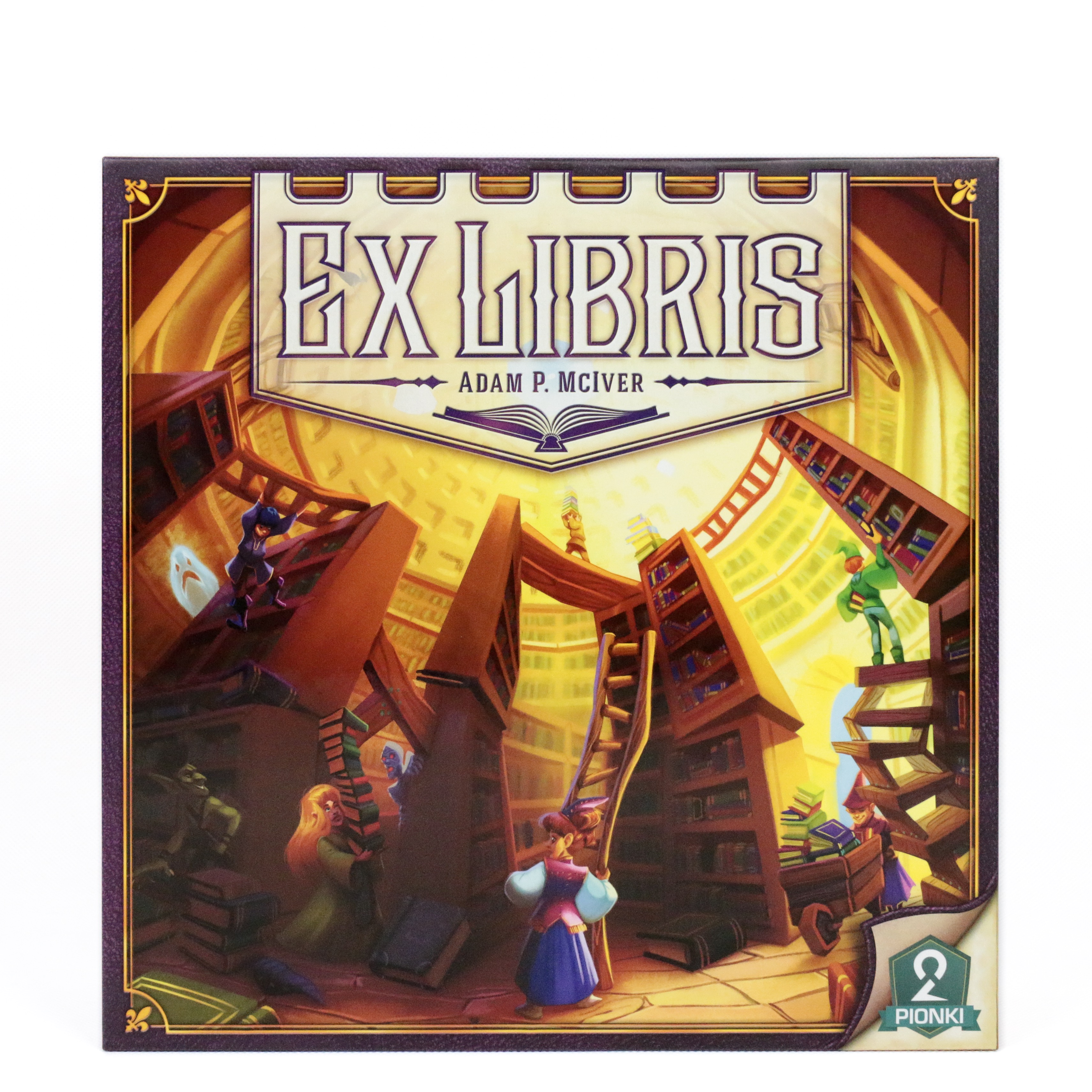 Ex Libris / Adam P. McIver ; ilustracje Jacqui Davis ; tekst polski Anna Dudek-Polewka. - Gliwice : 2Pionki : Portal Games, copyright 2018. - 1 gra (1 plansz Miasta, 1 formularz kontrolny zasobów bibliotecznych, 1 marker ścieralny, 12 kafli Bibliotek, 18 kafli Lokacji, 12 unikatowych pionów Starszych Pomocników, 12 pionów Pomocników Bibliotecznych, 1 znacznik pierwszego gracza, 152 karty Książek -łącznie 510 pozycji, 6 kart Katalogowych, 4 przewodniki po Lokacjach) : karton, tektura, plastik, drewno, kolor ; w pudełku 31x31x8 cm + instrukcja ([1], 22, [1] strony : ilustracje kolorowe ; 26x26cm).