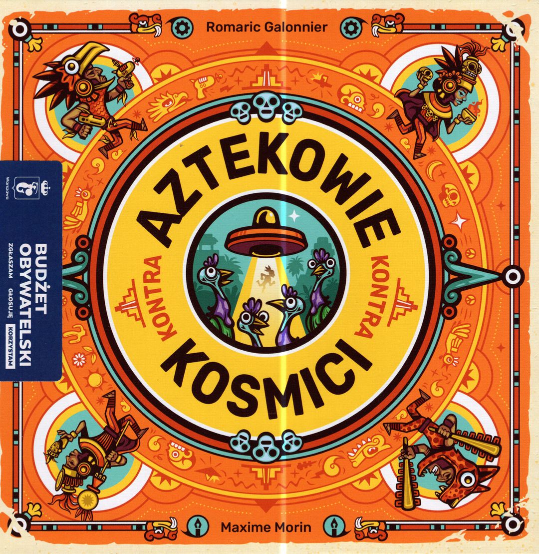 Aztekowie kontra kosmici : [gra planszowa] / autor gry: Romaric Galonnier ; ilustracje: Maxime Morin ; opracowanie wersji polskiej: Adam Bukowski, Paulina Kortas, Tomasz Czerwiński, Agnieszka Walczak ; opracowanie graficzne: Tatsiana Korbut. - Gdynia : Trefl, © 2023. - 1 gra (plansza, 4 zestawy kart: Tubylcy i indyki, Wojownicy, Rada starszych, MAZAK - (każdy zestaw składa się z: 10 kart Azteków, 3 kart świątyń, 3 kart latających spodków), 8 kart praw, 8 kafelków magicznych symboli, znacznik pierwszego gracza) : karton, tektura, kolor ; w pudełku 6x20x20 cm + instrukcja (7, [1] strona : ilustracje ; 19 cm).